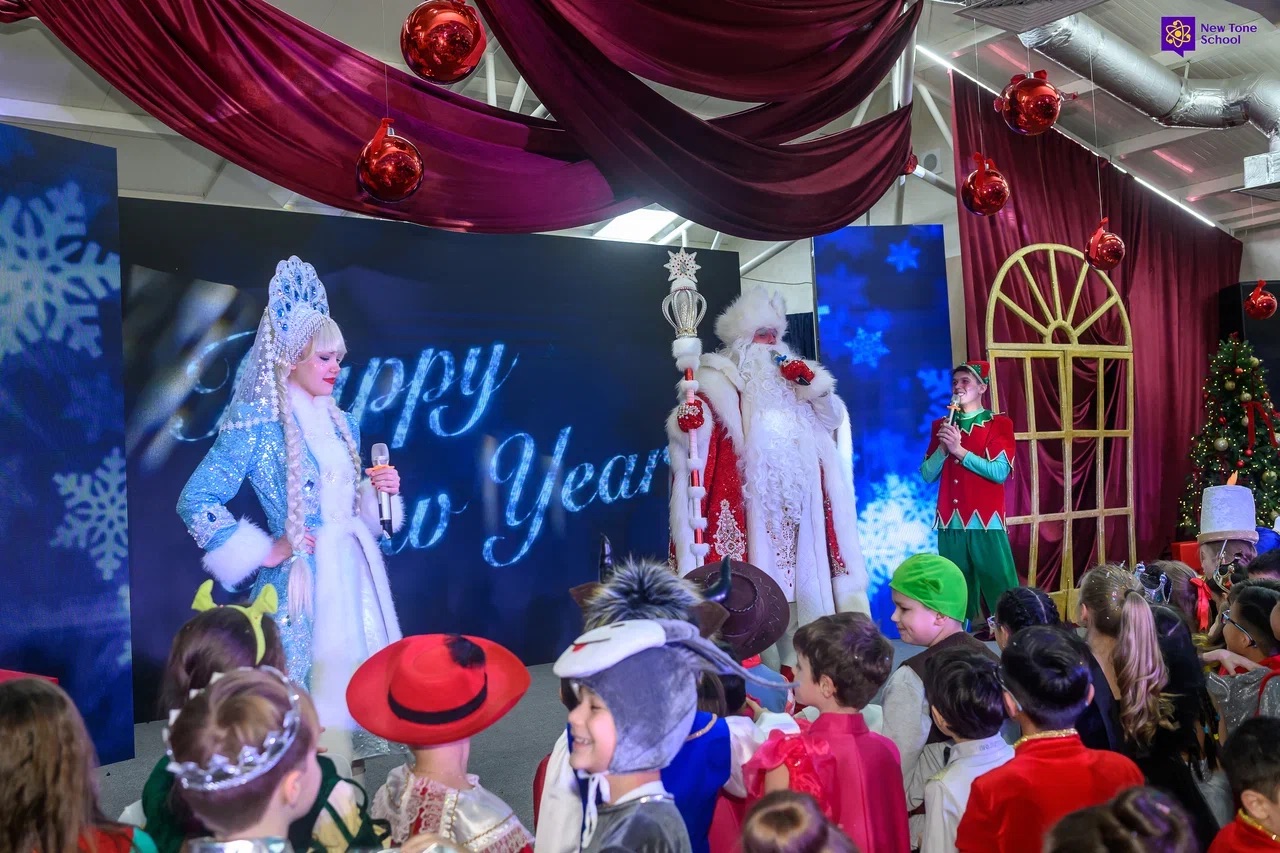 Ученики, их родители и учителя Английской гимназии NewTone поздравили друг друга с окончанием второй четверти и с наступающим Новым годом. Серия праздничных мероприятий была представлена сразу тремя шоу-программами — для младшей, средней и старшей школы.